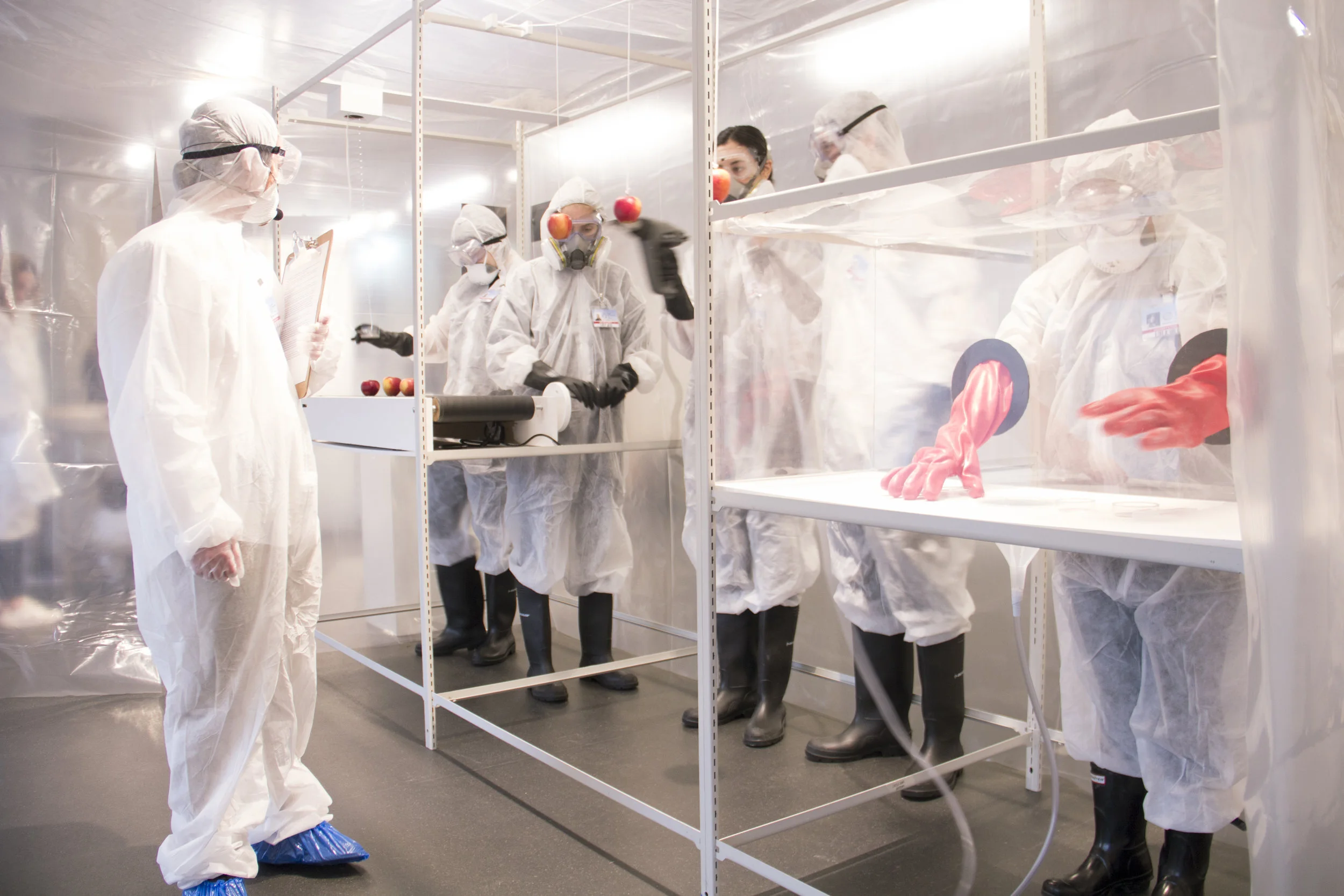 In 2018, keen to explore emerging nano-technologies, Spencer developed the ‘Nano Lamination Factory’, for the London Design Museum’s Future Factory Symposium, where visitors were invited to explore future technologies and think about how these might effect future manufacturing. Currently, much fruit and vegetables are coated in an artificial wax layer before being placed within plastic packaging as a means of protection and preservation; Spencer’s Factory imagined a future in which these methods of coating are replaced with edible nano cellulose. Members of the public were greeted by individuals in full PPE and became part of an educational performance of each future scenario, in one instance, being encouraged to spray red apples hanging from the ceiling with airborne nano cellulose.