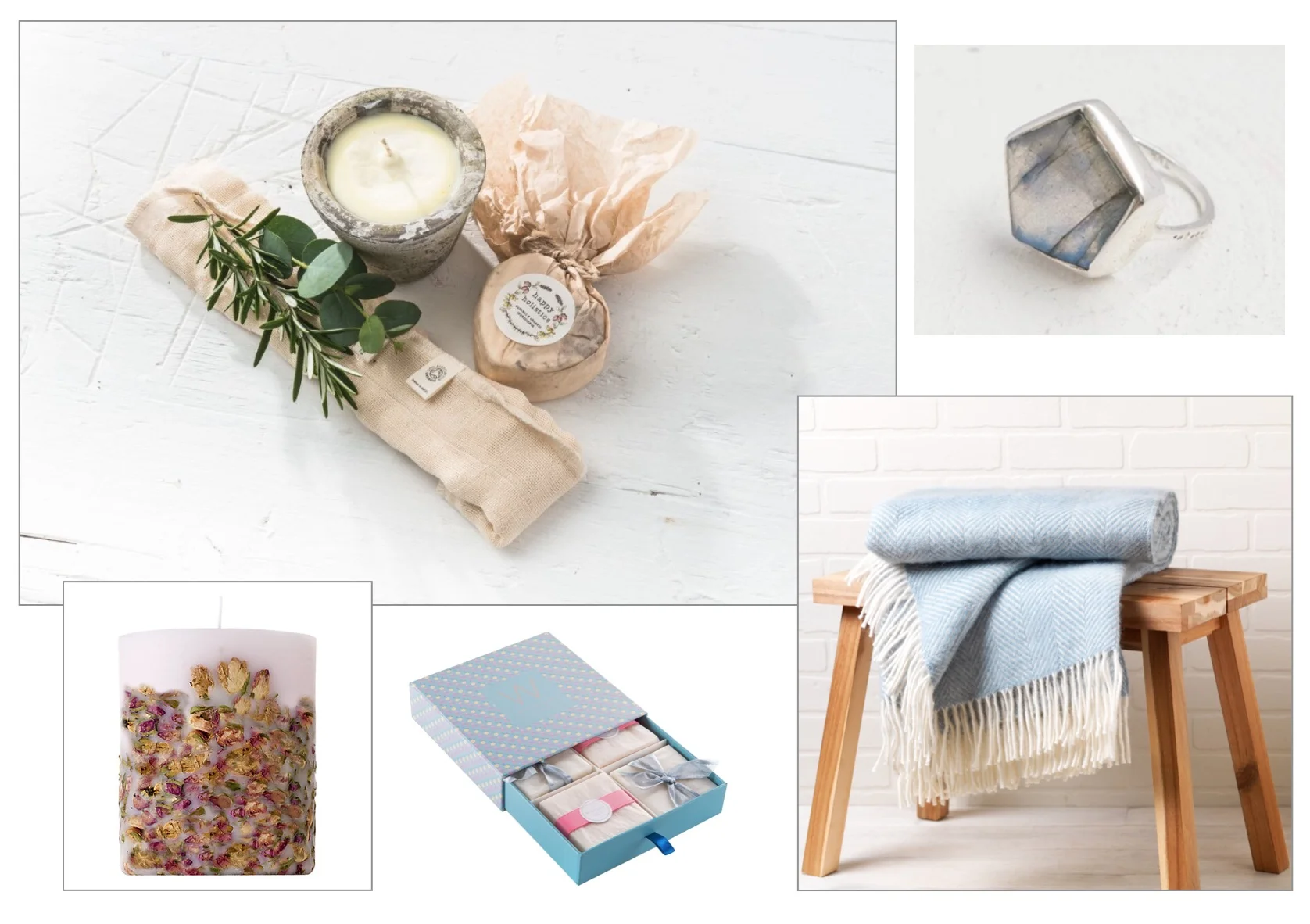 THE ROMANTIC (from top left): All in one: tiny posies of anemones, a handmade organic willow heart and some pretty pampering products make up Organic Blooms’ gorgeous Valentine’s Day Hamper, from £45. www.organicblooms.co.uk. Roses are red: made by hand, with a delicate scent, Acqua di Parma's candle will burn all Valentine's night long, £91. www.selfridges.com. Soap box: four hand milled soaps made with olive oil to keep hands naturally hydrated, £20. www.willowbeautyproducts.co.uk. Ganesha ring: the ultimate solitaire, on a thin band, by Tribe of Lambs. 100% of profits go to funding compassion projects for HIV+ children in India, £38. https://tribeoflambs.com. Feeling blue: a beautiful cosy wool fishbone weave throw made locally in Wales, £49.99. www.ethicalsuperstore.com